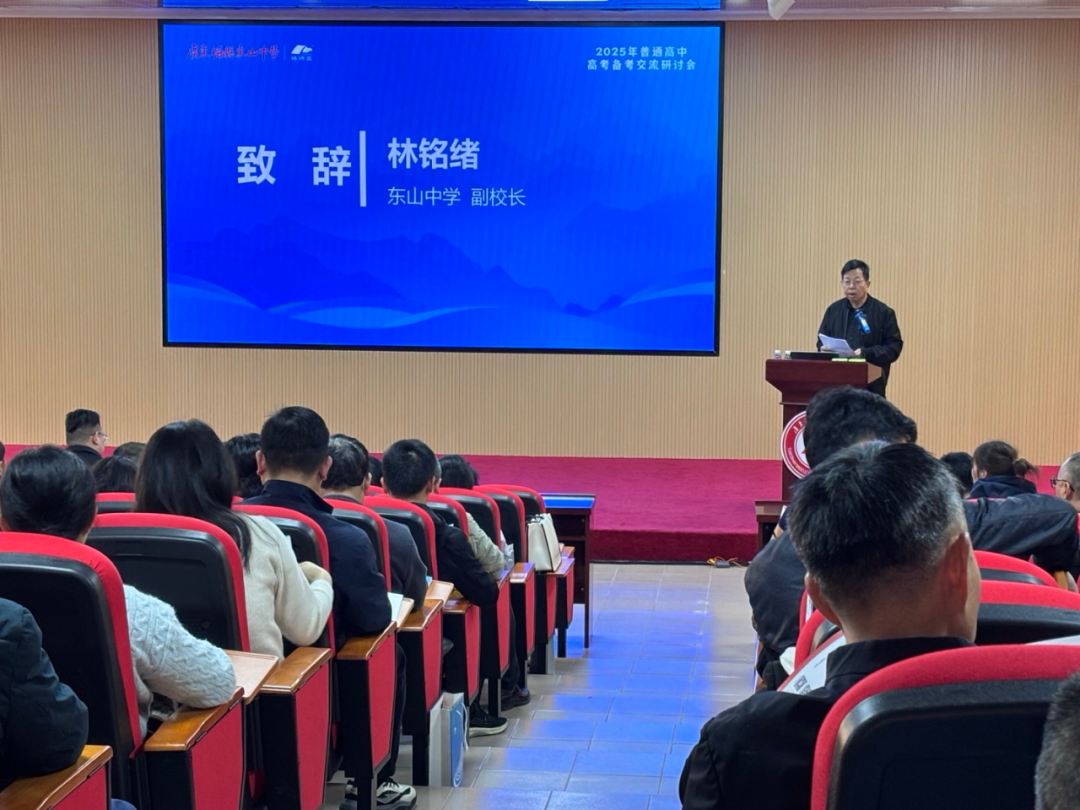 研讨会开幕式上,东山中学林铭绪副校长致欢迎辞,对与会嘉宾表示热烈欢迎,并简要介绍了学校近年来在高考备考方面取得的优异成绩和宝贵经验。他指出,新高考改革对山区教育提出了更高要求,我们必须迎难而上,积极探索适合山区学生的备考策略。同时,林校长强调,教师要坚持终身学习,保持开放的心态,精准高效备考,并贯彻核心素养理念,培养全面发展的学生。最后,林校长呼吁粤东地区各兄弟学校加强区域合作,共同探索高考备考的新思路、新方法,推动区域教育质量的整体提升。