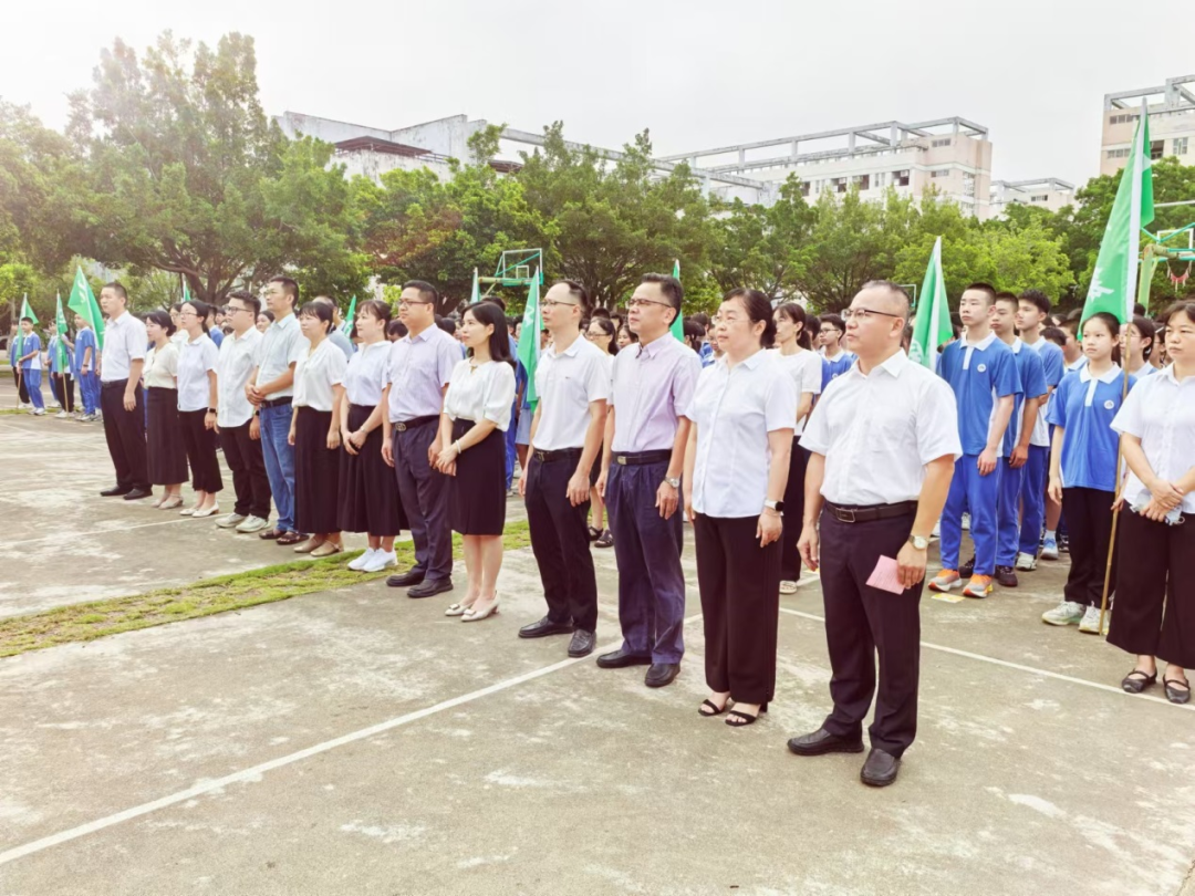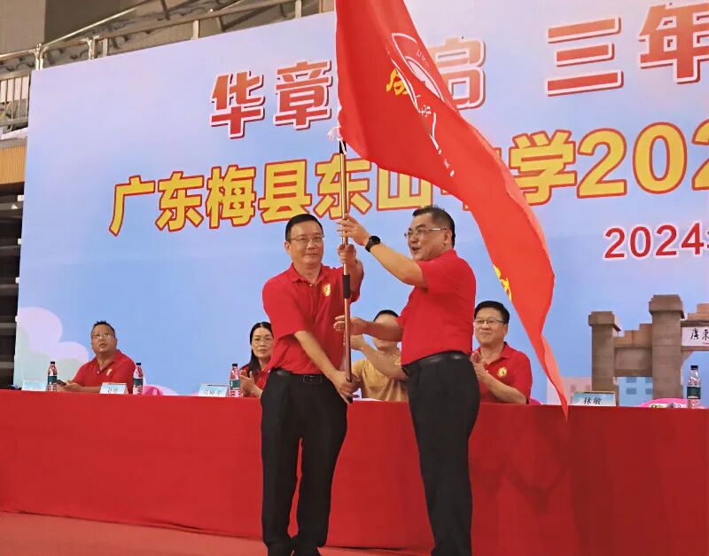 林敏校长将新高三旗授予年级组长李群喜老师,象征着高三学子正式踏上了高考的征程。随后,各班班长上台从林敏校长手中接过新班旗,展现班级的信心和决心。