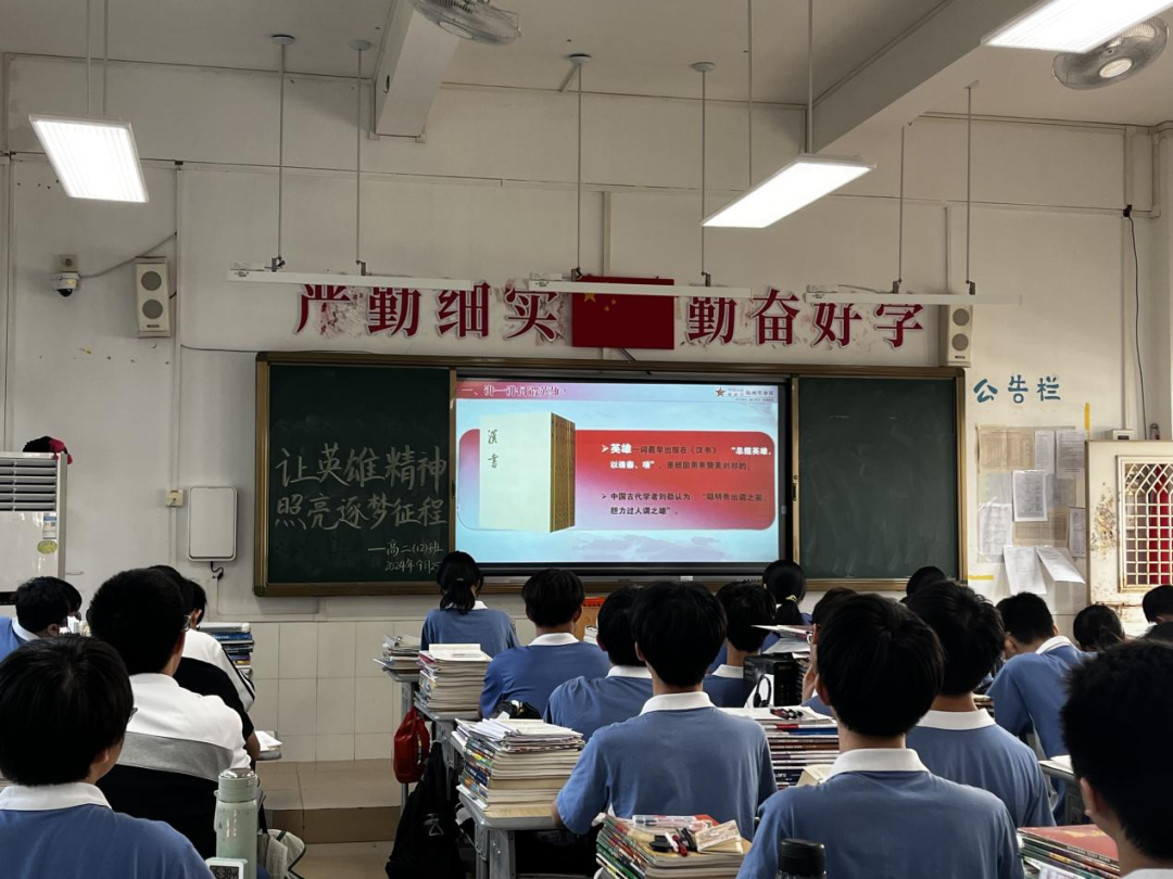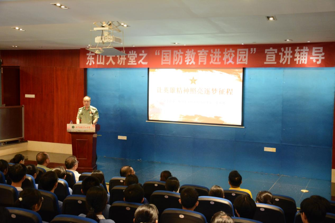 “让英雄精神照亮逐梦征程”,文进常委的讲座以习近平新时代中国特色社会主义思想为指导,立意高远,紧扣学子的思想追求。他以东中百年名校的深厚积淀、光荣的革命传统为切入点,由学子们身边最贴近、最熟悉的英雄说起,激发了大家的亲切感和自豪感。然后他从“何谓英雄”“为什么要崇拜英雄”“如何传承英雄精神”三个方面展开讲述,层层推进,大量征引了中华民族从古至今的各类鲜活的英雄事例。事例中的英雄志士,或救亡图存,舍生忘死;或抵御外侮,寸土不让;或克难攻坚,无私忘我;或心系黎民,鞠躬尽瘁……不管是烽火硝烟的战争年代,还是风云激荡的和平时期,无数中华儿女心怀家国,为我们留下了许许多多可歌可泣的英雄故事。他们有的抛头颅、洒热血,有的甘寂寞、隐姓名,以忠诚爱国的赤子之心,谱写了一曲曲令人荡气回肠的英雄赞歌。“沧海横流,方显英雄本色。”文进常委将许多名言金句与这些英雄传奇贯串于讲座主题内容的三个部分,配以大量丰富的图片、音频、视频,立体化地为师生们展现了英雄形象、英雄气概、英雄精神。大家的情感随着文进常委的深情讲演而激荡,感动时眼含热泪,激愤处紧握双拳,更加深刻地领悟了英雄的价值、增强了崇敬英雄之心。他还特别介绍了东中杰出校友叶剑英元帅在中国革命和建设的关键时刻四次力挽狂澜的事迹,以及梅州所具有的丰厚红色资源,极大地激起了东山人的荣誉感。胸怀国之大者,树立远大理想,学习英雄事迹,增强国防观念,讲座在第三部分“如何传承英雄精神”奏响最强音。文进常委总结说,“一代代英雄创造了如今的盛世中国,一份份责任如今交接到我们的肩上”,他向大家发出号召:“我们要在历史的馈赠中传承好英雄精神,在灵魂深处撒下英雄的种子,学习英雄、崇尚英雄、争当英雄,让新时代的逐梦征程遍开英雄之花,让我们的祖国更加强大,让我们的民族更加兴旺!”讲座中,文进常委既展现出军人的威武之气,又如师长般给学子们带来儒者之风,让大家领略到新时代军人的独特魅力,他的演讲获得了全场一阵又一阵热烈的掌声。