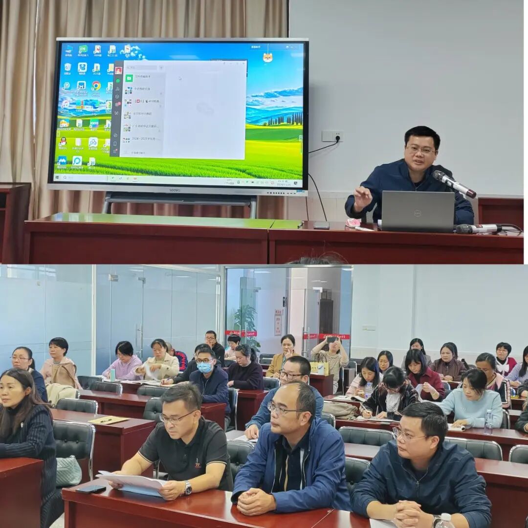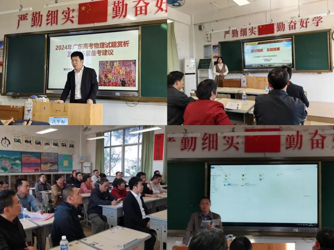 物理分会场由物理教研组组长谢纲群老师主持。邓彩燕老师详细介绍了在一轮复习启动前的准备、不同复习阶段的侧重点、现在的教学进度、学生学习情况、教学方法和策略,并着重在课堂教学和课后作业落实作了分享。例如,通过在课堂上精选精讲习题,强化学生建模能力,训练学生主动分析、归纳、书写和表达的能力;课后批改作业用心,做到讲必练,练必改,改必评,评必思;制定学生成长档案,通过课后辅导,加强对学生学习情况的跟踪和反馈,及时发现并解决问题。市教研员洪华标老师结合2024年高考相关数据,作了《2024年广东高考物理试题赏析及2025届高考备考建议》主题讲座。高考物理试题通过创设真实情境,考察学生的必备知识和关键能力。首先是培养学生的读题审题能力,例如读题干、物理图像、表格等信息;审题要善于简化问题、注意挖掘隐含的信息。潮州金山中学陈主任作为教师代表,在会上分享自己的教学心得和备考策略。最后,教务科副科长钟志伟老师提出,通过这次活动交流,大家相互学习一些好的做法,为学校物理学科的发展共同努力。