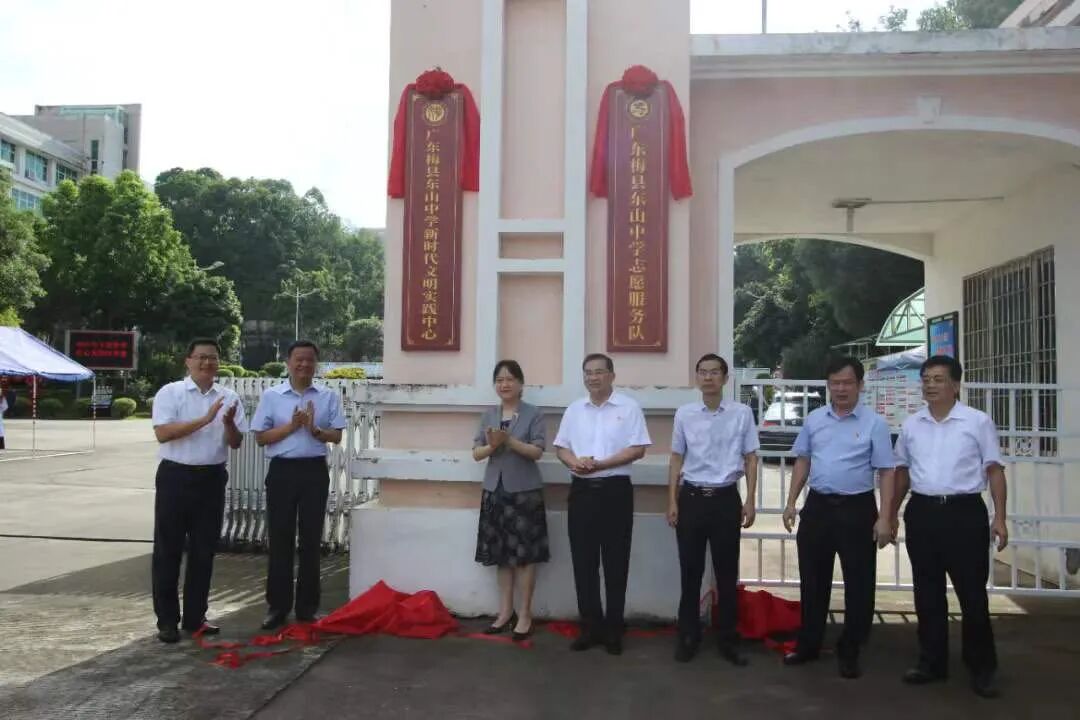会前,与会领导为广东梅县东山中学新时代文明实践中心、广东梅县东山中学志愿服务队揭牌。