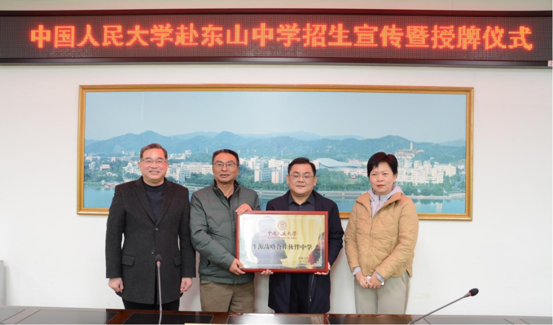 1月24日上午,中国人民大学广东招生组组长王亚星教授一行到我校开展“中国人民大学生源战略合作伙伴中学”授牌仪式暨招生宣传活动。我校党委书记郭思健、校长林敏、高三校区行政和教师代表以及“攻关班”学生代表参加了座谈会。