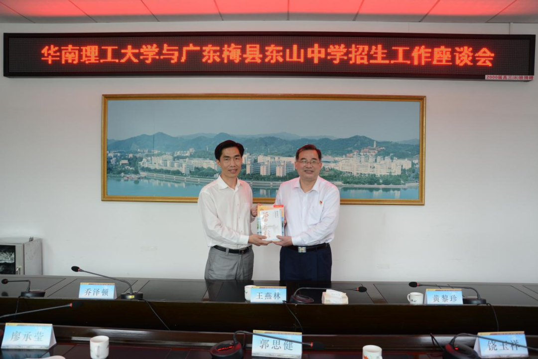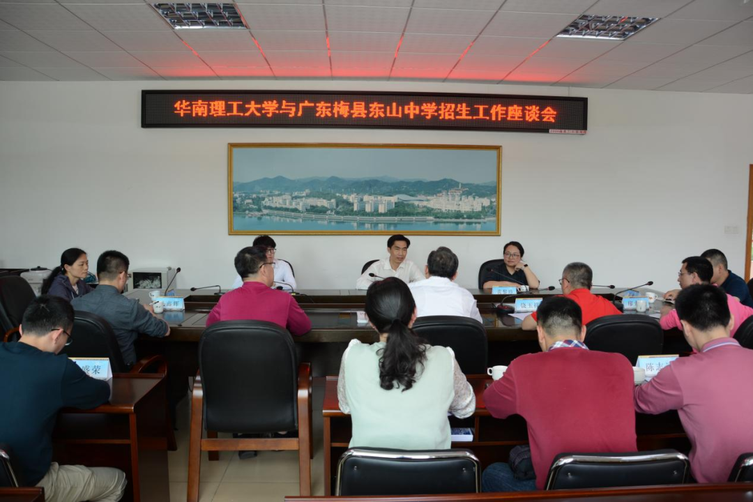 4月12日下午,华南理工大学生物科学与工程学院党委副书记、梅州市招生宣传组组长王燕林一行到我校开展招生工作宣讲,并举行座谈交流、科普讲座等活动。华南理工大学随行领导和老师,学校郭思健校长、廖承莹副校长、办公室等相关科室负责人、高一和高三校区部分行政、高三年级组长和部分班主任参加了座谈会。座谈会由办公室饶玉祥主任主持。
