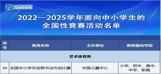据悉,全国中小学生绘画书法作品比赛,是经教育部公示2021-2022学年面向中小学生的全国性竞赛活动之一。活动由中国儿童中心于1995年创办,现已成为国内覆盖面最广、参与学生最多的全国性美育活动之一,是一项有着广泛影响力的青少年素质教育的活动,也是教育部保留下来具有引领性的美育竞赛项目。