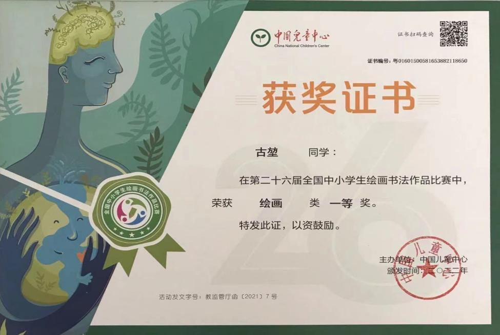 在第二十六届全国绘画书法作品比赛中,我校古堃同学荣获全国高中组一等奖。