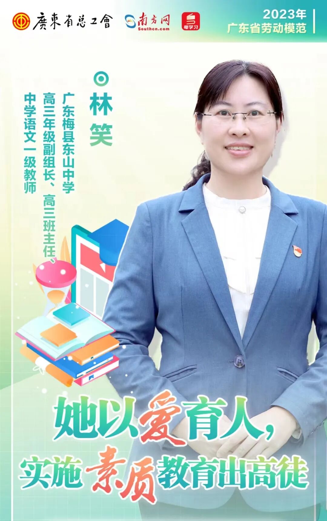 林笑老师,现任我校高三年级副组长、高三班主任。扎根教育教学一线18年,她始终不忘“教书育人、立德树人”的初心,爱国爱党,依法执教;严于律己,廉洁从教;率先垂范,敬业乐教。作为一名20年党龄的共产党员,她坚持把思想政治工作贯穿教育教学全过程,将社会主义核心价值观植根课堂,激励学生传承中央苏区梅州和百年东山中学的红色基因,先后培养了20多位学生获省、市级“三好学生”“新时代好少年”“宋庆龄奖学金”等表彰。她曾获“梅州市优秀教师”“梅州市科教系统优秀团干部”“优秀共产党员”“先进班主任”“先进教职工”等荣誉。2022年5月她现任班主任的班级团支部获“梅州市五四红旗团支部”称号。