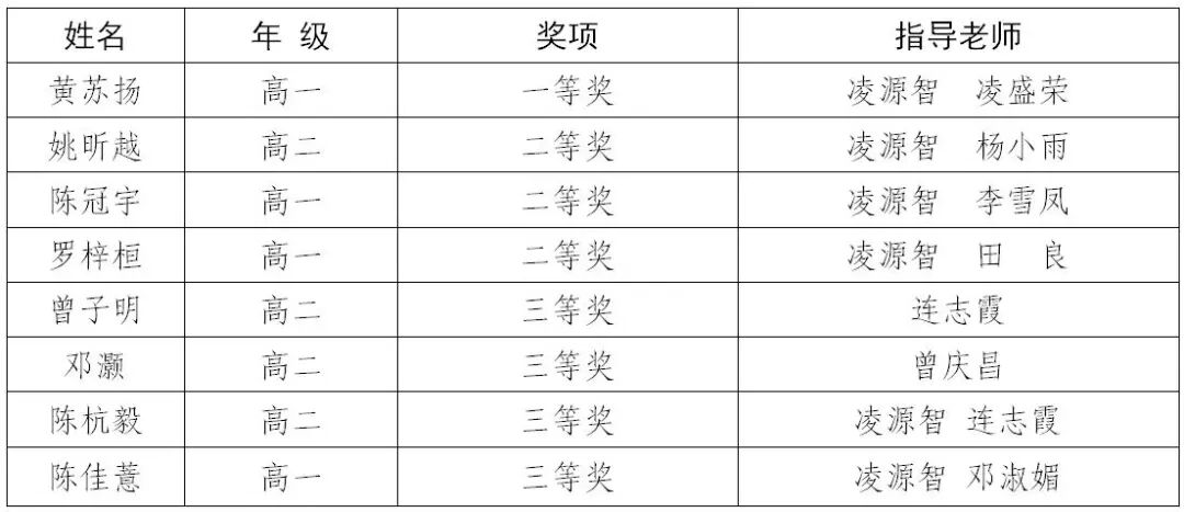 2021年全国中学生生物学联赛(广东赛区)成绩近日公布,我校学子再创佳绩:有1人获得一等奖,3人获得二等奖,4人获得三等奖;其中一等奖获得者是来自高一年级的黄苏扬同学。具体获奖名单如下: