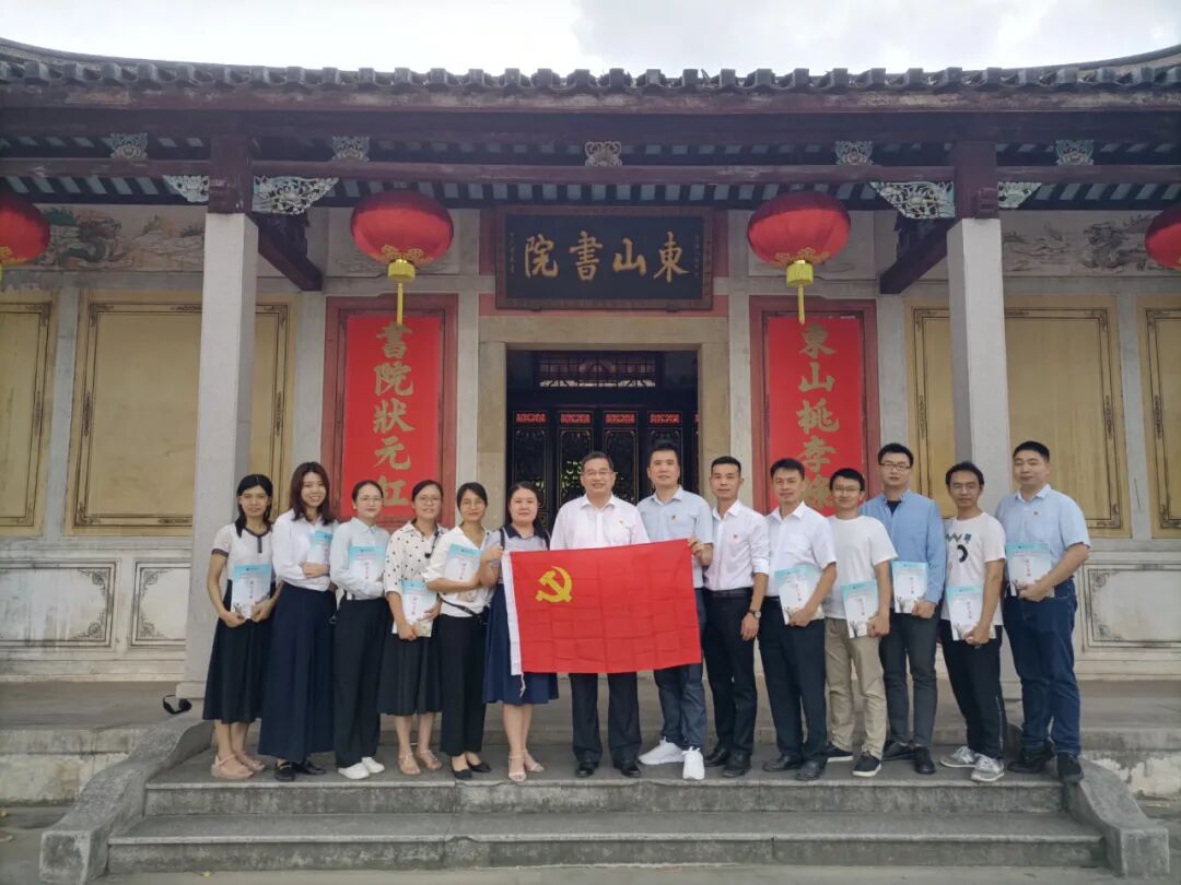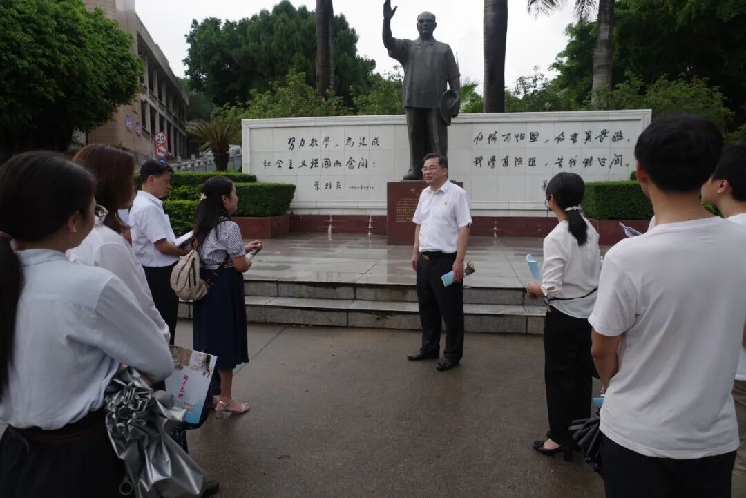 红色资源是鲜活的历史,也是党史学习教育最生动的教材。7月1日下午,学校党委书记郭思健带领学校预备党员、入党积极分子和近年新入职的教职工,从学校发源地东山书院出发,探访追寻了分布在校内的东山书院、老校门、叶剑英元帅铜像、东山第一亭、萧向荣将军玉雕像、东山英烈纪念亭六处红色足迹。每到一处,郭书记都详细地向大家讲解了其中的红色故事,带领着大家一同感受红色情怀,缅怀革命先烈,勉励后辈们要铭记革命历史,厚植家国情怀,传承红色基因。