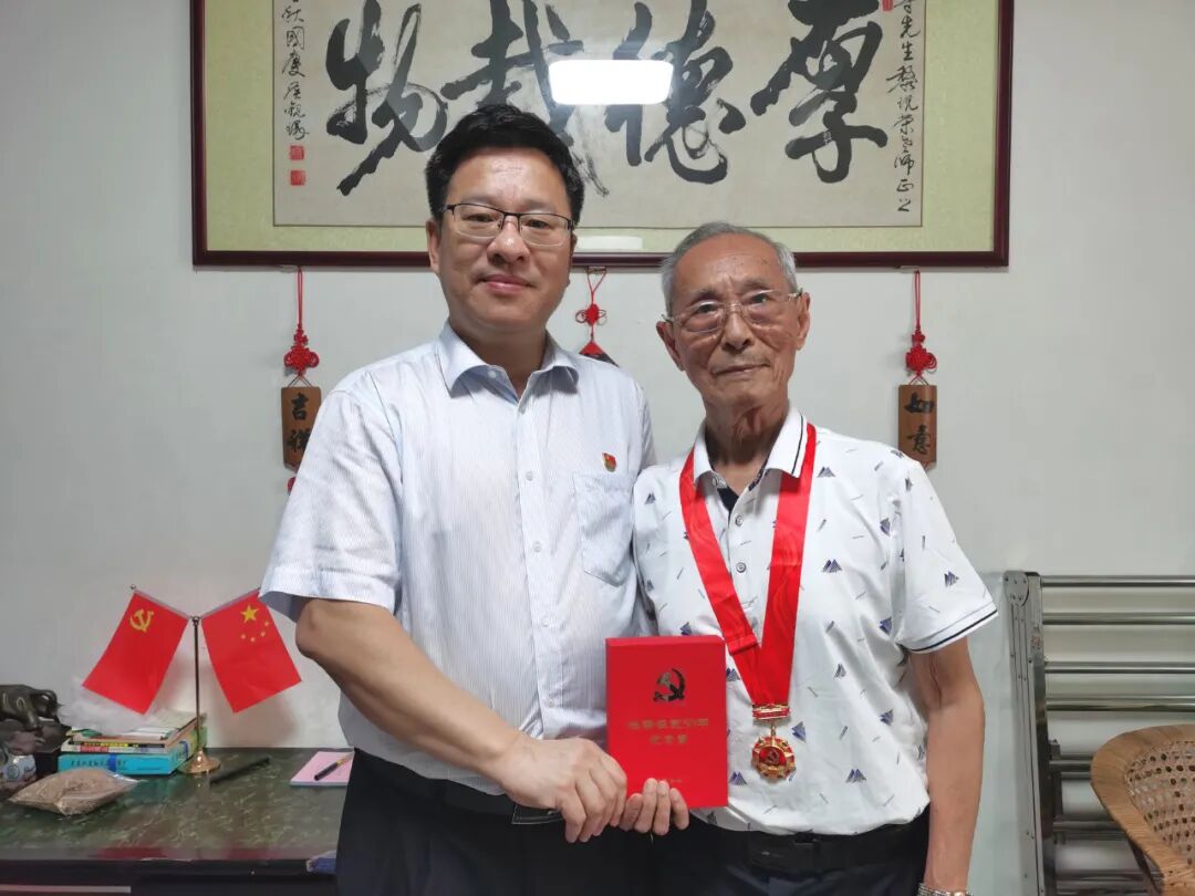 50年党龄,50载荣光。我校有3位退休教师荣获“光荣在党50年”纪念章,他们是:廖尊老师、陈翔英老师、刘德华老师。在党的百年华诞即将到来之际,受学校党委委托,我校廖承莹副校长、李炜豪副校长分别带队前往在梅的老党员廖尊老师和陈翔英老师家中颁发“光荣在党50年”纪念章。在老党员家中,带队领导代表学校党委向荣获纪念章的老党员表示诚挚的问候和崇高的敬意,为老党员佩戴纪念章,展开亲切交谈。老党员纷纷表示,“光荣在党50年”纪念章是一生中最珍贵的纪念礼物,深深感受到了党的关怀和温暖。老党员廖尊同志即兴赋诗道:“光荣在党六十余,终生护李盼桃红,初心不改跟党走,鹤发童心永前奔”,表示今后将不忘初心、牢记使命,为学校教育事业积极建言献策,发挥余热,贡献力量。