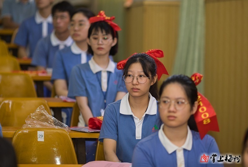 东山中学高考动员大会,学生将红丝带系在头发上。