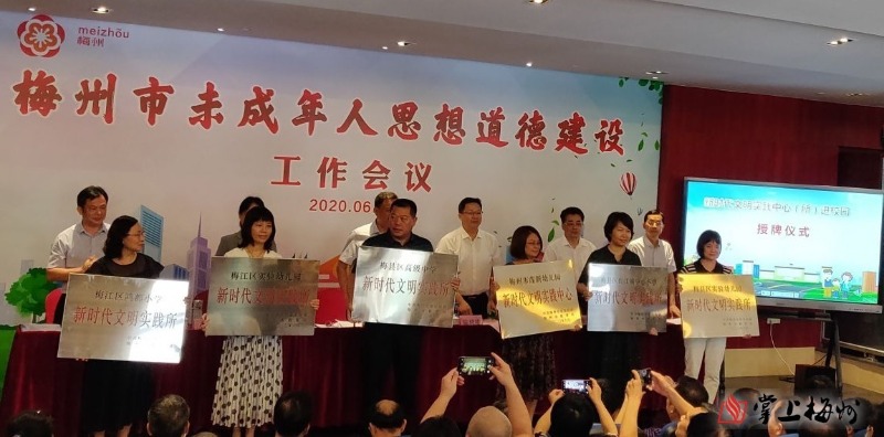 会前,与会领导为广东梅县东山中学新时代文明实践中心、广东梅县东山中学志愿服务队揭牌;并参观文明校园、观摩《“扣好人生第一粒扣子”——文明健康·珍爱生命主题教育实践活动》。活动在东山中学初中部思政课教师廖苑村主讲的一节“致敬生命 感恩前行”主题思政课中拉开帷幕,随后介绍了广东新时代好少年陈泓毓的优秀事迹,并观看了杯花歌《文明礼仪代代传》、诗词朗诵《战疫赋》和《闪闪红星故事会》节目表演。随后召开工作会议回顾总结2019年梅州市未成年人思想道德建设工作,部署2020年工作。