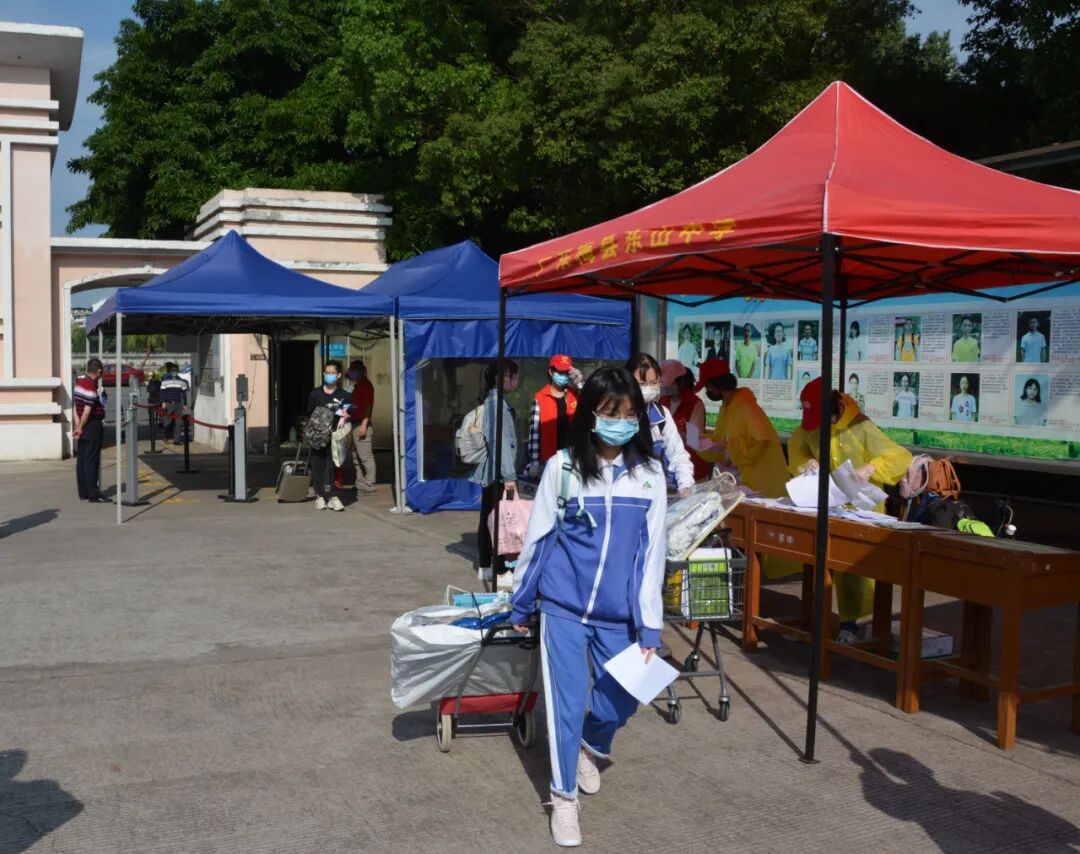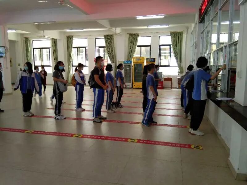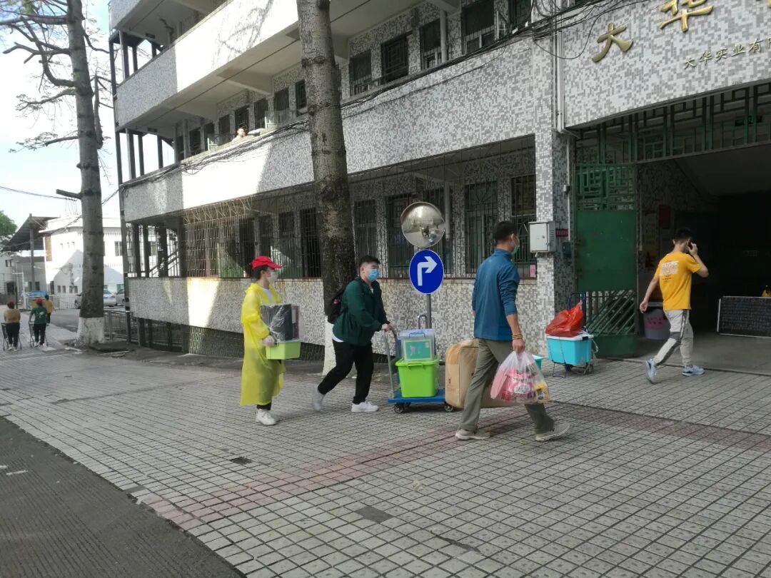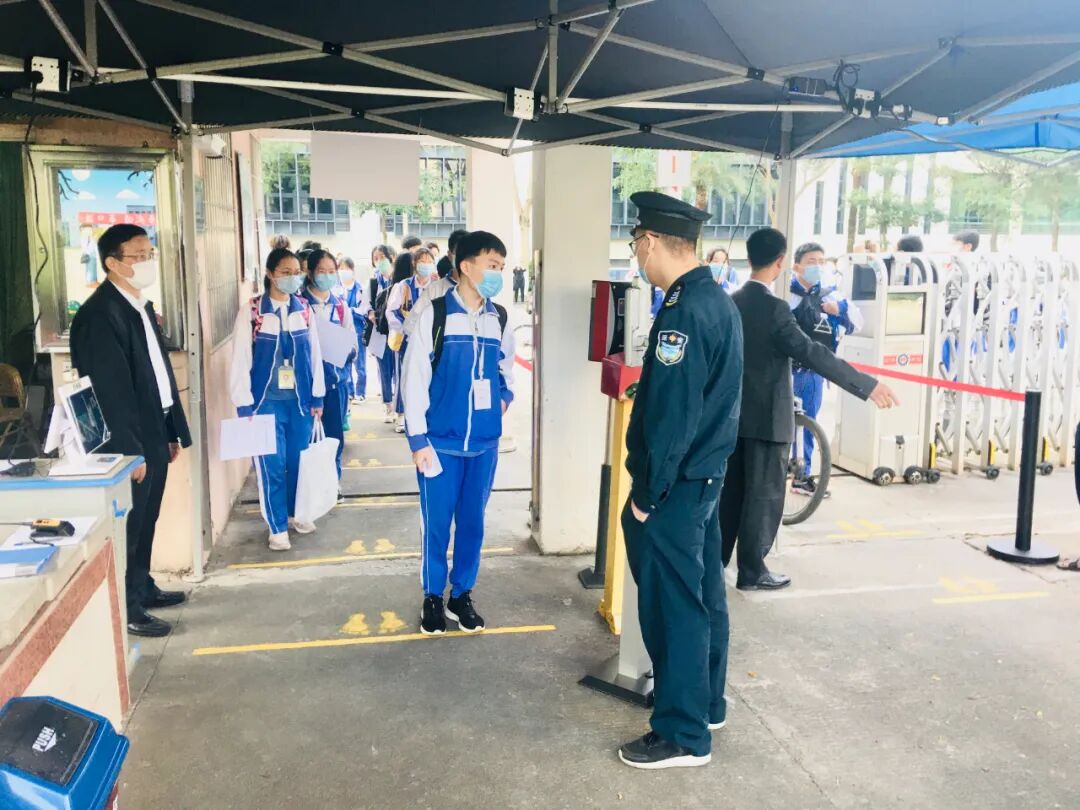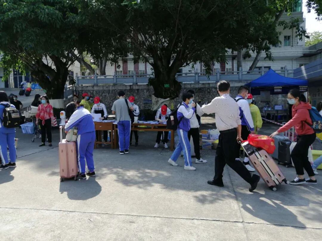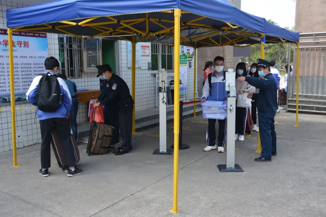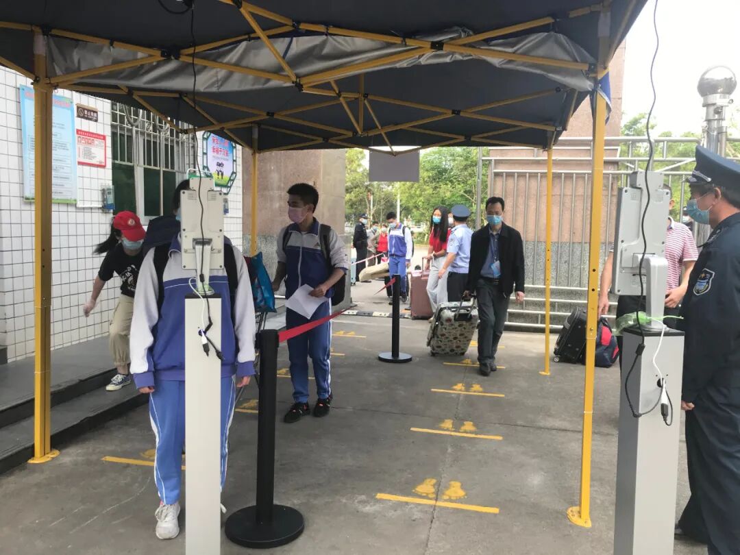 学校三个校门全部开放,每个校门设置两个进入通道,每个通道安装一台智能一体机。老校门和西校门迎接高三学生,剑英校门迎接初三学生。各个校门秩序井然,学生们依次检测体温、体温正常后方可进入校门。老师们一大早就已经在各个校门内等候归来的学子,在学生测体温的同时,老师们、志愿者们用手推车等帮学生搬运行李,忙得不亦乐乎!各个校门的门卫认真指导学生做好体温检测,还有校医、食堂员工、宿舍管理员、校门外协助维护秩序的警察同志、市疾控中心驻点人员等坚守各自岗位,你们辛苦了,为你们点赞!