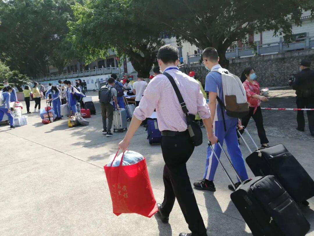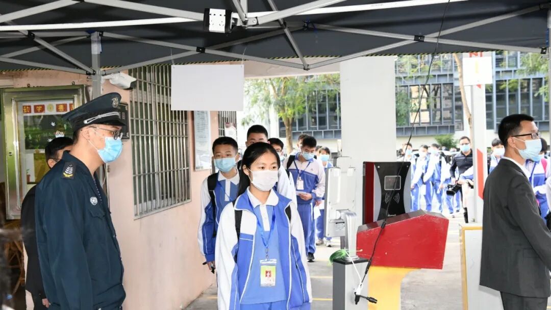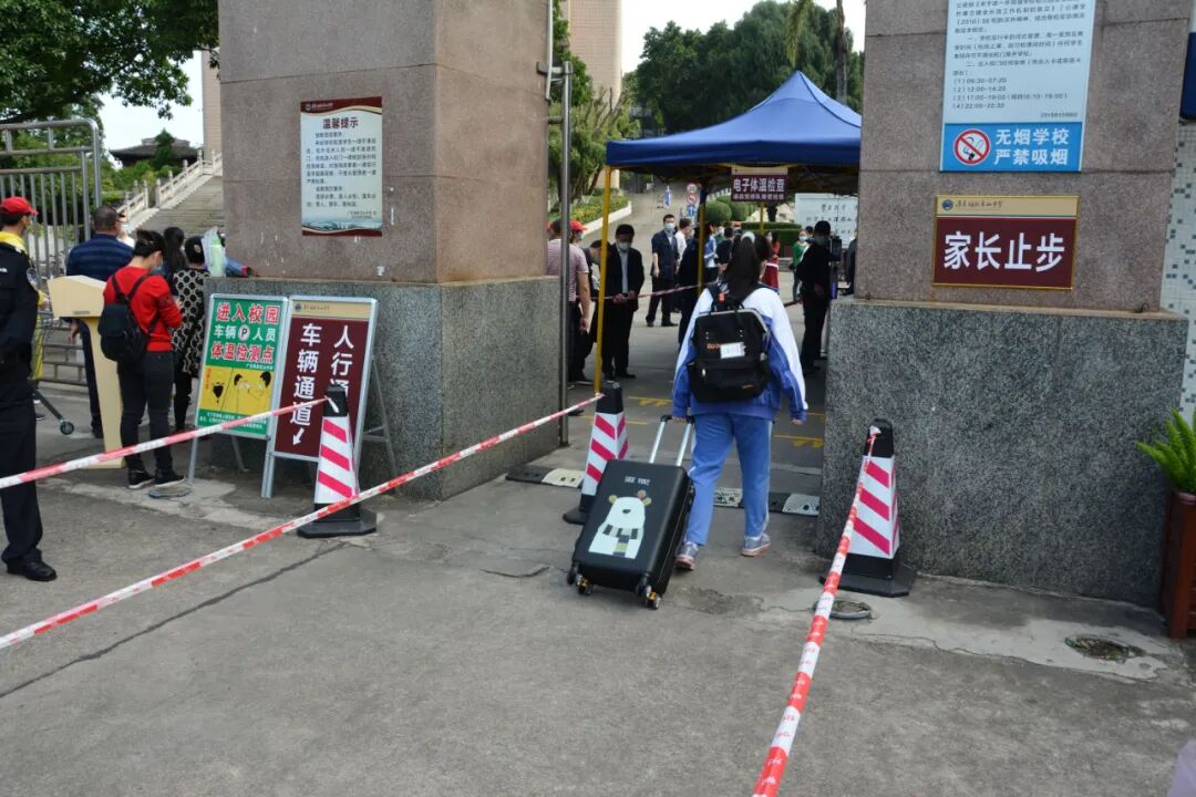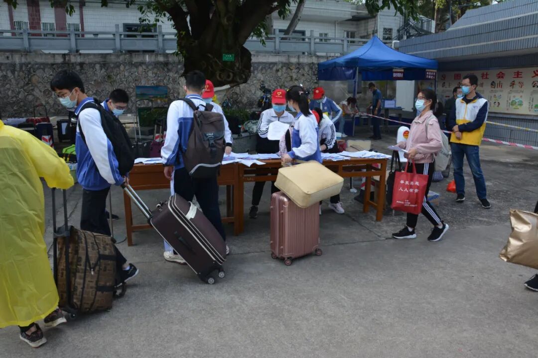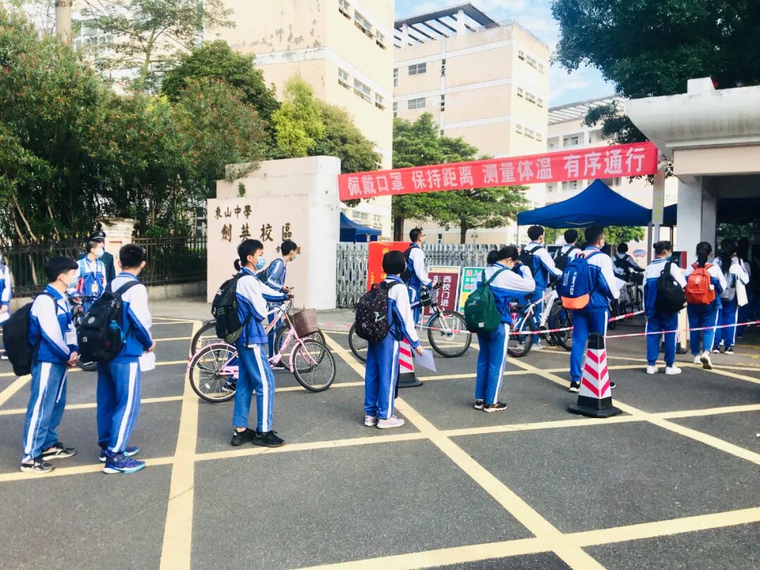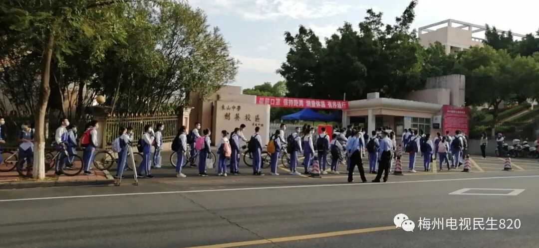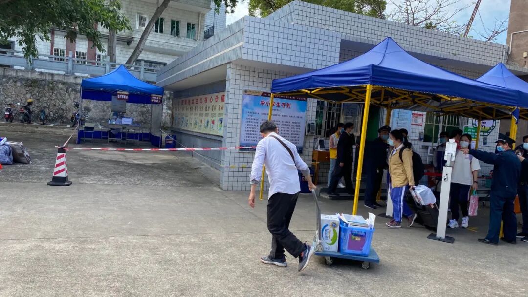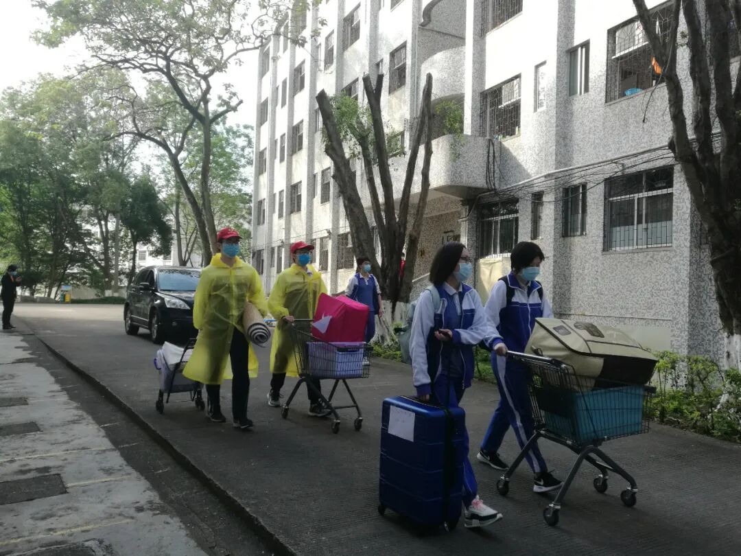 学校三个校门全部开放,每个校门设置两个进入通道,每个通道安装一台智能一体机。老校门和西校门迎接高三学生,剑英校门迎接初三学生。各个校门秩序井然,学生们依次检测体温、体温正常后方可进入校门。老师们一大早就已经在各个校门内等候归来的学子,在学生测体温的同时,老师们、志愿者们用手推车等帮学生搬运行李,忙得不亦乐乎!各个校门的门卫认真指导学生做好体温检测,还有校医、食堂员工、宿舍管理员、校门外协助维护秩序的警察同志、市疾控中心驻点人员等坚守各自岗位,你们辛苦了,为你们点赞!