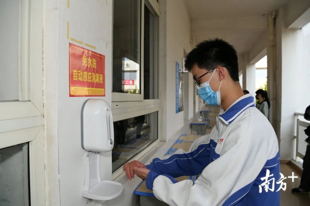 每个课室外面都设置了免水洗自动感应消毒液,同学们可以随时洗手。
