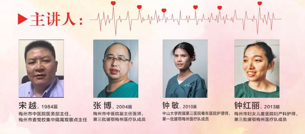 5月14日下午,学校在李昆章艺术楼团校组织开展“讲述战疫故事,传承红色基因”思政课。活动邀请了援鄂梅州医疗队、在梅隔离观察点医护成员的东中校友,他们是:宋越,1984届校友,梅州市中医医院医务部主任,疫情期间担任梅州市党校集中隔离观察点主任;张博,2004届校友,梅州市中医医院副主任医师,第三批援鄂梅州医疗队成员;钟敏,2010届校友,中山大学附属第三医院粤东医院护理师,第一批援鄂梅州医疗队成员;钟红丽,2013届校友,梅州市妇女儿童医院妇产科护师,第三批援鄂梅州医疗队成员。