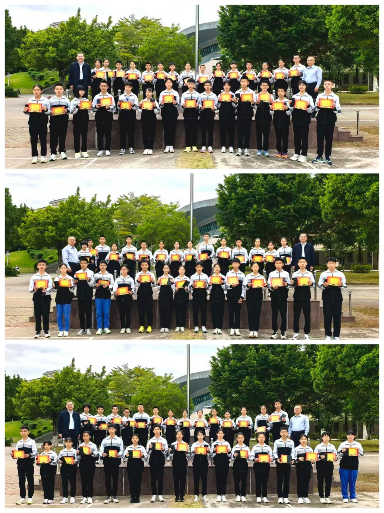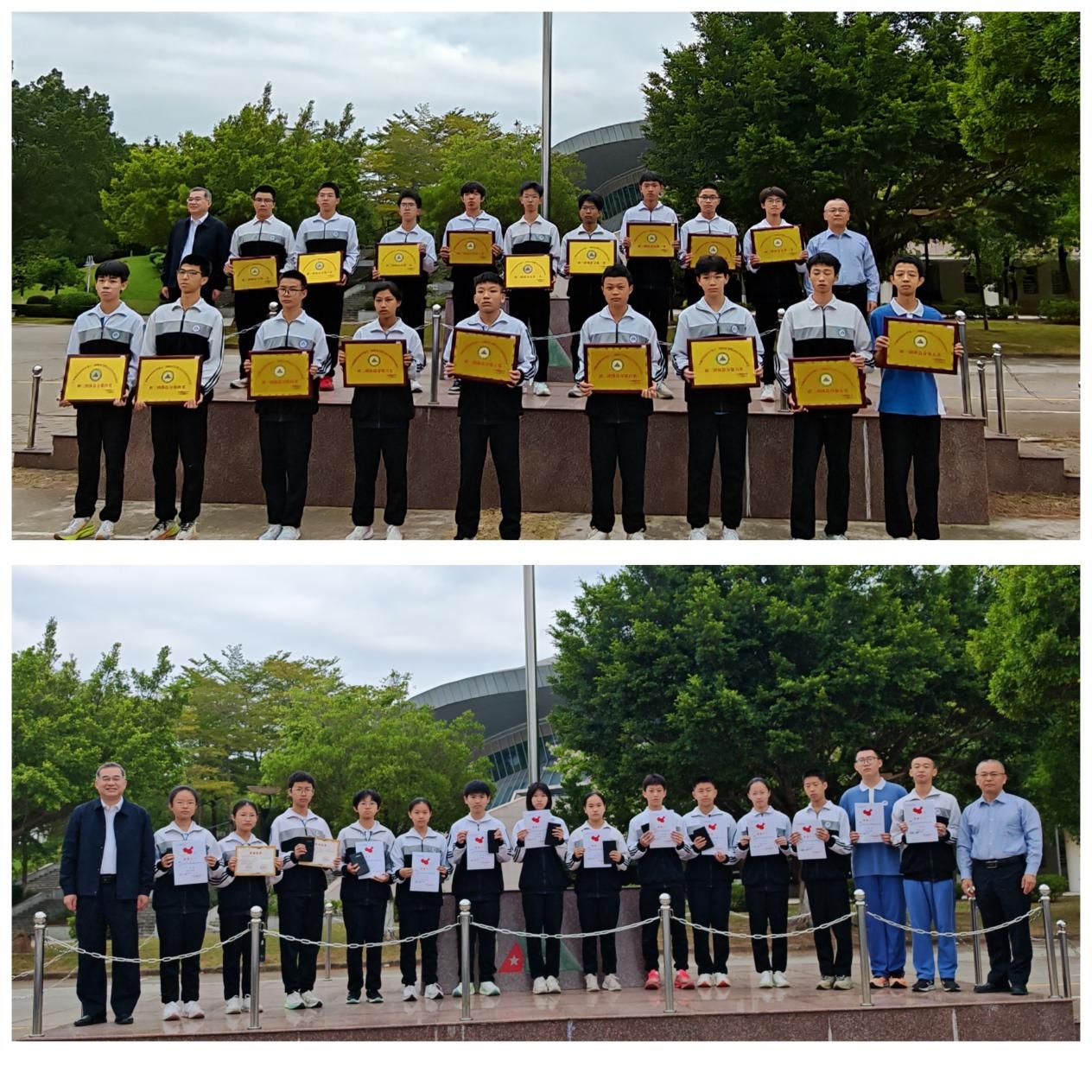 升旗仪式隆重组织了各项表彰,分别是教育部白名单赛事“美丽中国”全国版图知识竞赛获得者、广东省“小小科学家”科学实验活动中获奖者、校运会中荣获团体总分前六名的班级和中段考试取得优异成绩的各年级一等奖获得者,郭书记和初中部主管饶玉祥老师一起为他们颁发了奖状和奖品。表彰类型丰富多样,初中部通过这种方式,不断鼓励同学要善于挖掘自己各方面的潜力,找到自己的闪光点,做一个自信的阳光少年。