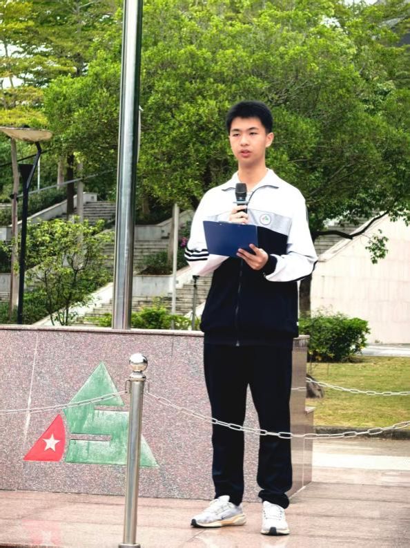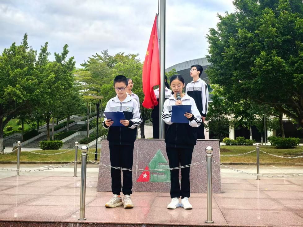 仪式由初二(10)班徐子越和初二(14)班黎致霖同学共同主持。主持人介绍了本次升旗仪式的旗手与护旗手:升旗手温夏玮同学(初二2班)品学兼优、体育成绩突出,曾多次在市级乒乓球比赛中获奖;护旗手叶梓妍、潘建宇同学同样来自初二2班,他们勤奋好学、积极向上,是同学们身边的榜样。