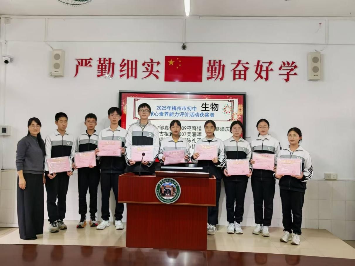梅州市初中生物学科核心素养能力评价活动里,谢梓琪、李陈宸同学摘得市一等奖,江宸璋、蓝好、幸嘉龙、康子骞、温夏玮同学获市二等奖,黄艺雯、程诺同学获市三等奖。