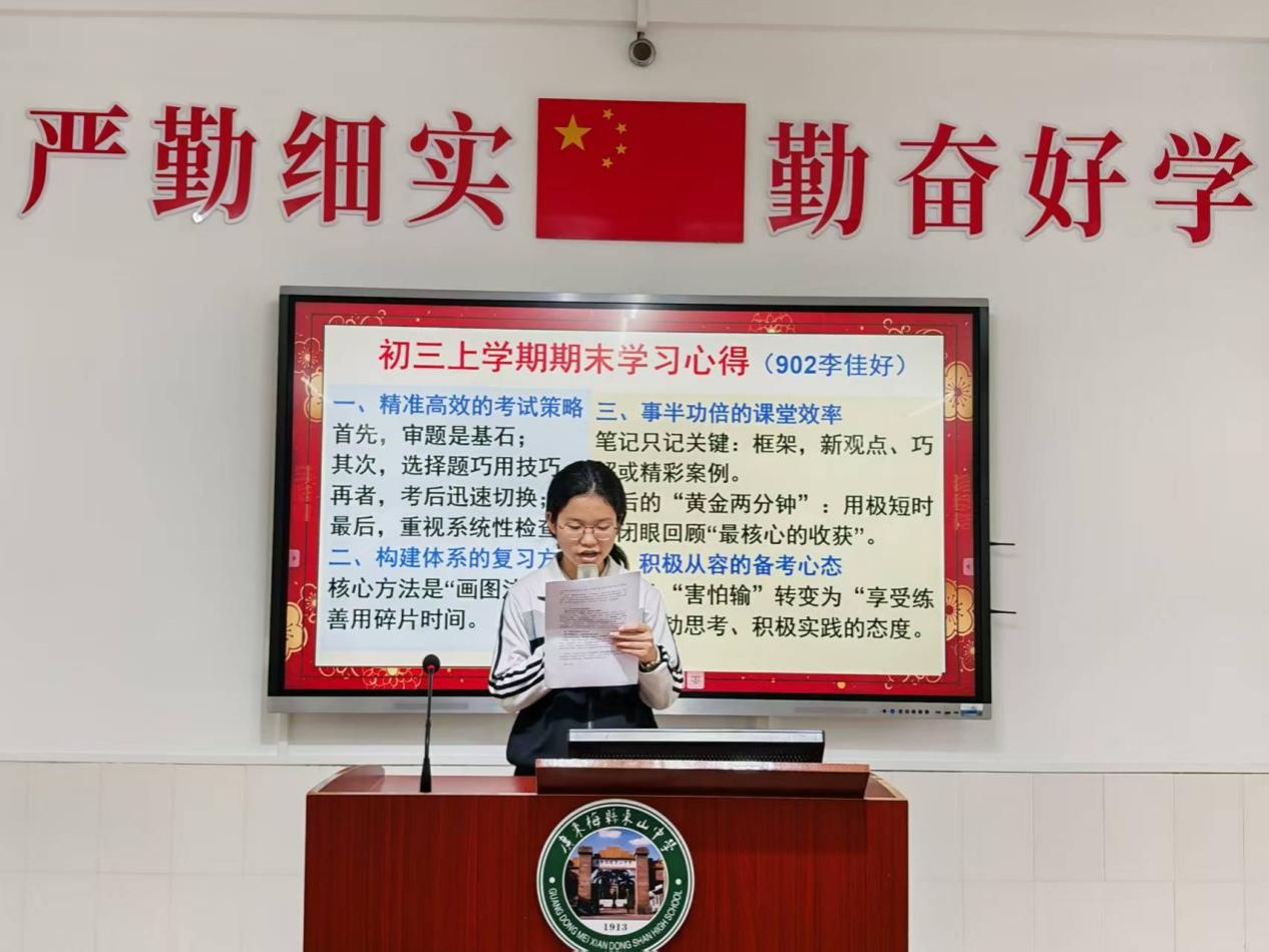 初三(2)班的李佳好结合自身学习经验,从考试技巧、复习方法、课堂效率和心态调整四个维度分享心得。她提出的“知识地图”复习法、审题圈画技巧、课堂“听懂优于记全”原则,以及“将测验视为练习机会”的积极心态,为同学们的假期学习与未来备考提供了实用指引。现场还播放了往届高三学长的假期总结视频,以榜样的力量激励同学们合理规划时间,让假期过得充实而有意义。