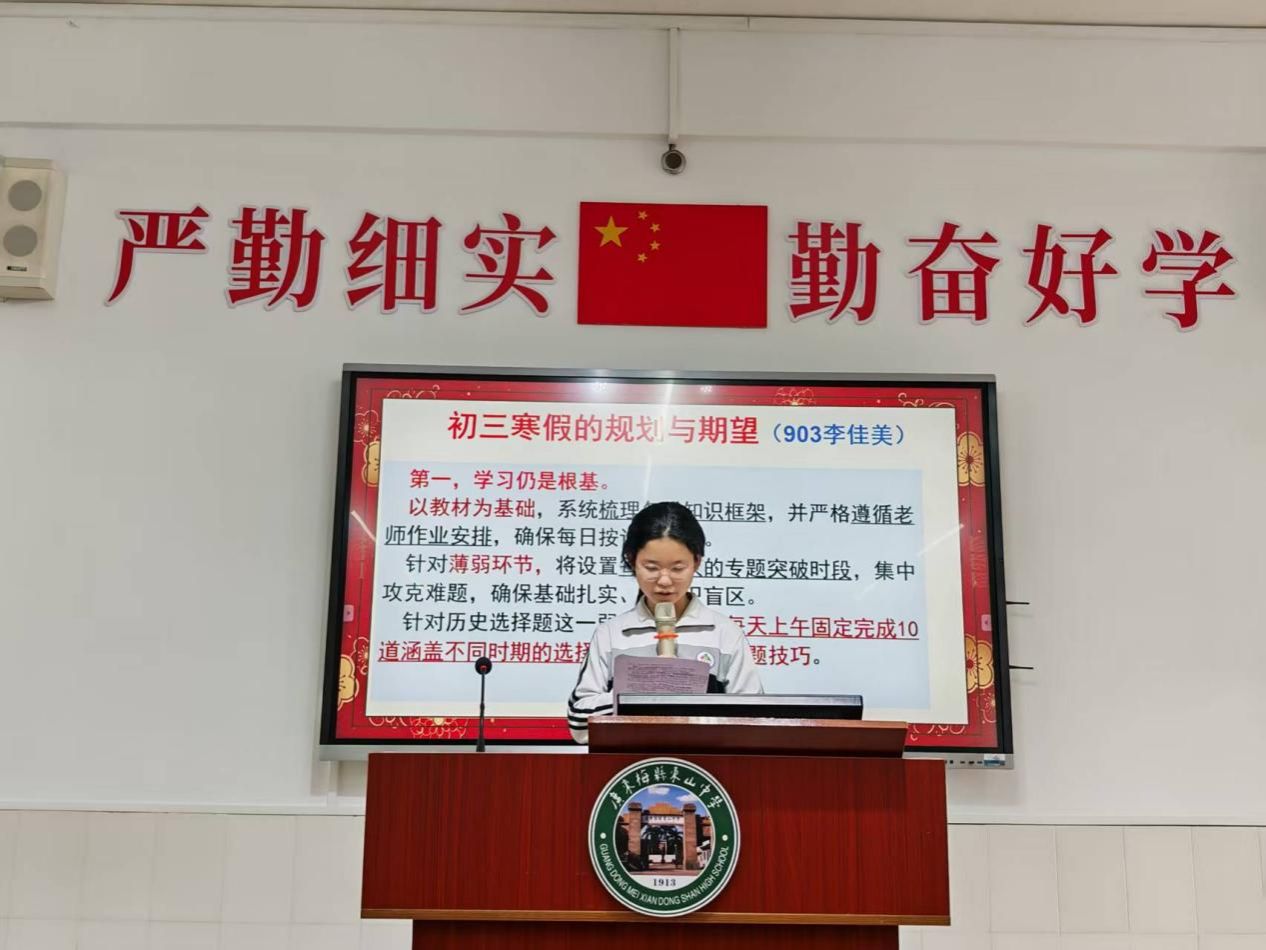 假期是休整的驿站,更是自我提升的黄金时期。初三(3)班学生代表李佳美上台分享了她的寒假规划与期望。她表示,作为初三学子,将以中考为目标,分阶段系统复习各科知识,重点突破物理电路分析、数学函数综合等薄弱环节,同时坚持每日阅读、体育锻炼,主动承担家务劳动,并积极参与社区志愿服务,让假期成为知识巩固、能力提升、品格涵养的全方位成长之旅。