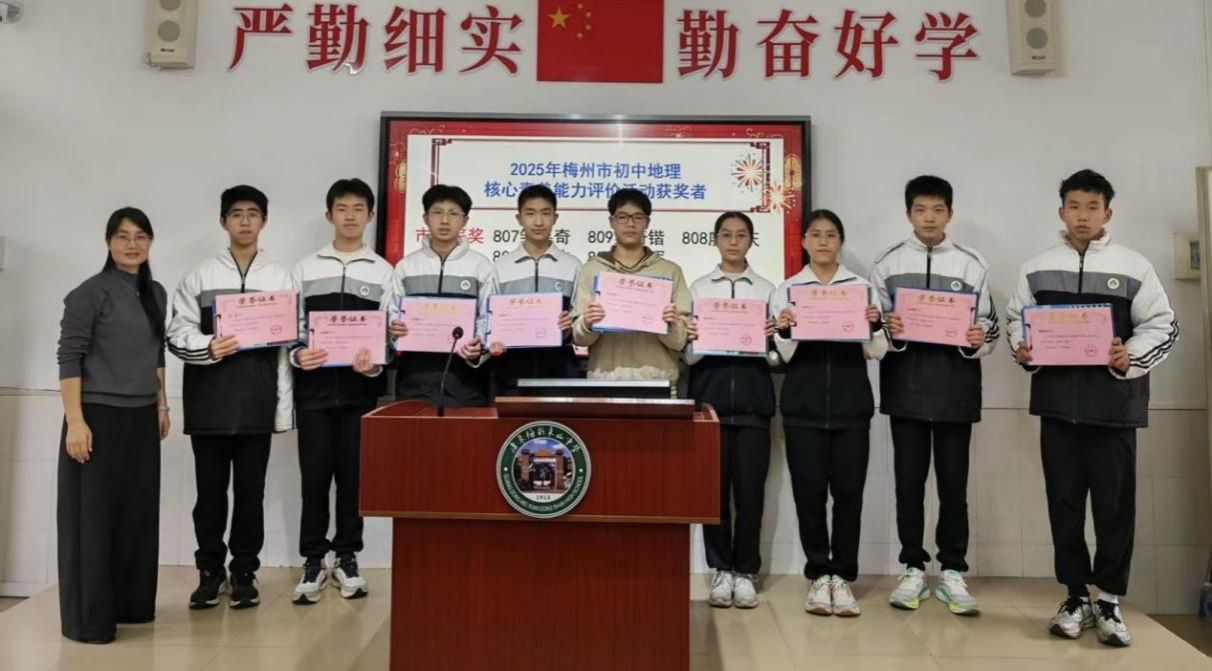 梅州市初中地理核心素养能力评价活动中,邹嘉奇、巫奇锴、廖潼庆、古祖欢、吴濯晖同学勇夺市一等奖,梁城锋、陈礼涵同学获市二等奖,罗誉、陈佳霓同学获市三等奖。