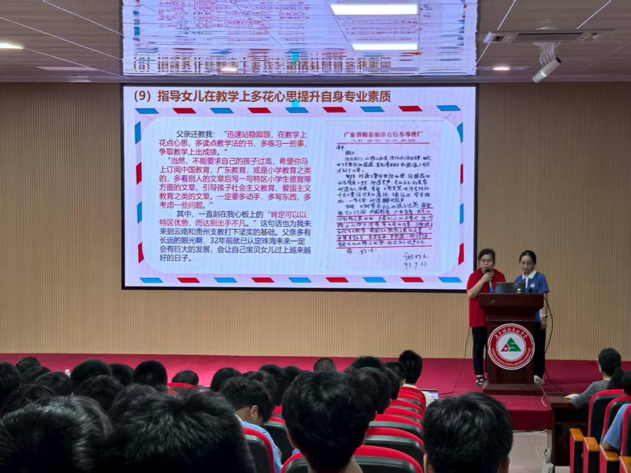 讲座开场,谢春平分享了她的家书故事。她提及,梅州的山水不仅孕育了她的成长,更塑造了她的品格。她的爷爷奶奶来自传统客家家庭,浓厚的家国情怀令她深感钦佩;父亲是改革开放后的第一代企业家与工程师,工作态度严谨细致;叔叔作为自行车轮框行业的全国知名“大王”,曾荣获全国劳动模范称号。优良的家风深刻影响了她的为人处世之道。初到珠海任教时,父亲通过书信再三叮嘱,教导她要成为党和人民满意的好老师,勉励她研习党的先进理论,精心钻研教学以提升专业素养,并叮嘱她要关爱学生、与同事和睦相处。现场,高三学子齐声诵读了这封泛着岁月痕迹的家书,字里行间,亲情满溢,更蕴含着两代人对教育事业的赤诚坚守,令在场师生深切领悟到家风家教对个人成长的深远影响。
