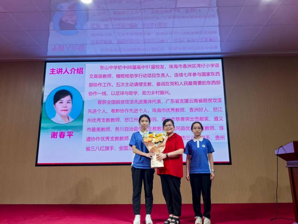 2025 年 8 月 22 日,全国三八红旗手、东山中学初中 88 届及高中 91 届校友谢春平重返母校,于阶梯教室为高三师生开展了一场主题为《跟党奋进新征程 躬耕教坛行不辍》的专题讲座。讲座由高三级部周东贤老师主持。