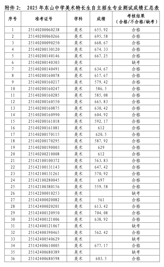 附件2:2025年东山中学美术特长生自主招生专业测试成绩汇总表