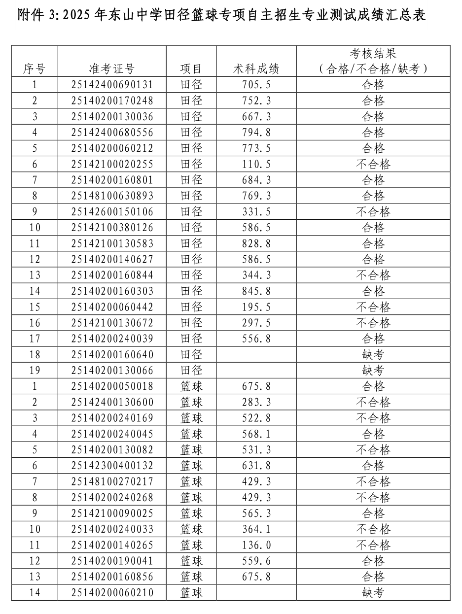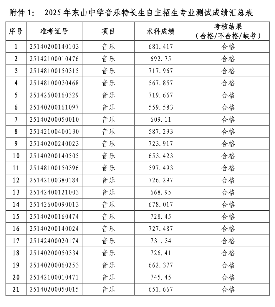 根据《关于做好 2025 年梅州市高中阶段第一批招生学校体育艺术特长生招生工作的通知》(梅市教体〔2025〕14号)、《关于下达2025年我市高中阶段第一批招生学校以及民办学校体育艺术特长生自主招生计划的通知》(梅市教体〔2025〕16号)等文件精神,以及《2025年广东梅县东山中学音乐、美术特长生招生简章》、《2025年广东梅县东山中学田径、篮球专项特长生招生简章》要求,2025年6月2日,我校坚持公平公正、择优选拔的原则,组织专家评委对符合报考条件的音乐美术特长生、田径篮球专项生进行了专业技能测试,现对考生测试成绩予以公示。公示期间,如有异议,请向考核工作领导小组提出书面申请。反映情况必须使用真实姓名和联系方式,匿名信函不予受理。