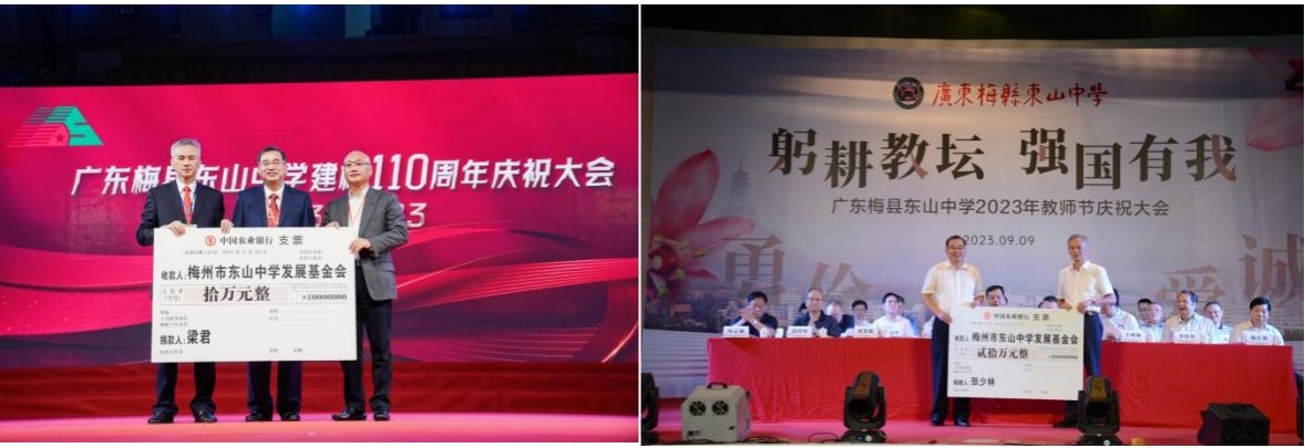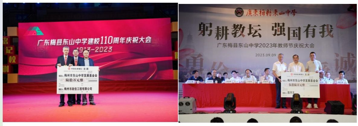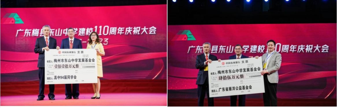 83届张少林校友定向捐资,设立少林创新班奖教奖学金;02届章航校友定向捐资,设立教职工关爱基金;91届李志方校友定向捐资,设立“中智”学科竞赛奖励基金;89届全体校友定向捐资,设立综合实践创新专项基金;东中数学组潘朝芳老师的一位学生定向捐资,设立潘朝芳数学奖教奖学金;曾智明先生定向捐资,设立“曾智明奖教奖学基金”东山中学奖励金;广东省雁洋公益基金会定向捐资,设立“叶剑英基金奖教奖学”东山中学奖励金;广东政佳建筑工程有限公司定向捐资,设立广东政佳建筑工程有限公司“东山中学管理过程奖”奖励金;梅州市希望教育基金会定向捐资,设立梅州市希望教育基金会高三备考奖教金;90届一位热心校友定向捐资,设立张其标地理奖教奖学金;美盛隆制罐(惠州)有限公司定向捐资,设立美盛隆制罐(惠州)有限公司东山中学“创新人才培养基金”;1927届校友叶凤生后裔定向捐资,设立叶凤生奖学金;97届陈振宇校友定向捐资,设立春明语文奖教金;梅州市陈志云慈善基金会定向捐资,设立“梅州市陈志云慈善基金会”东山中学助学金;陈志云先生定向捐资,设立陈志云助学金;06届罗献辉校友定向捐资,设立孔昌助学金;89届郭洛先校友定向捐资,设立初中综合实践活动基金;99届邬雄辉校友定向捐资,设立“沃土计划”和“脱颖计划”基金;05届李晋元校友定向捐资,设立高三初三临界生指导教师奖励。