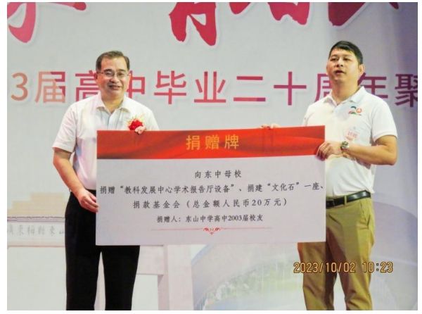 长期以来,东山情深的校友们借毕业逢十周年归宁聚会之机,积极为母校捐建项目,交付学校使用。2023年以来,已有高中93届捐建教科发展中心体能训练室和升级改造沈兰芳电教楼阶梯教室、高中03届捐建教科发展中心学术报告厅、高中94届捐资升级改造老校区多功能阶梯教室、高中04届捐资升级改造尊师楼105多功能会议室、高中95届捐赠先进血压仪给教职工、高中05届捐赠AI自习室设备与捐种树木等项目顺利落成,以数字赋能母校,绿化美化母校,加强母校办学保障,助力母校高质量发展。
